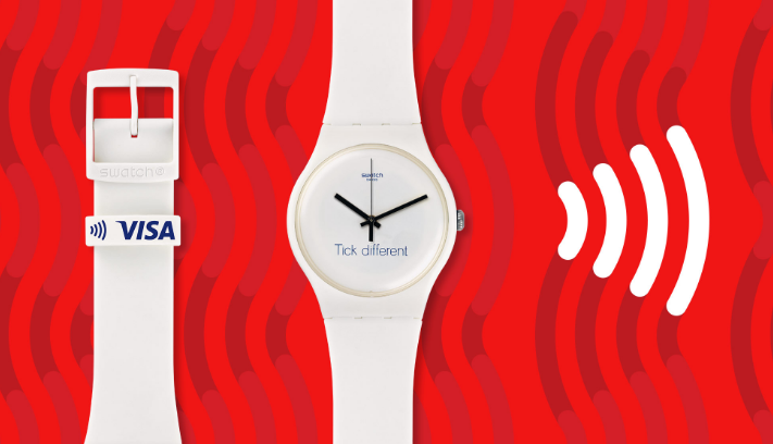 Visa et Swatch lance en partenariat une montre classique, équipée d’une puce NFC. Loin d’être une « montre connectée », la tocante surnommée Bellamy permet toutefois des usages intéressants. Le nom de cette montre Swatch vient de l’auteur Edward Bellamy, qui avait imaginé en 1888, le monde de l’an 2000 où les cartes de paiement auraient remplacé la monnaie. C’est ce que vise cette montre à son tour : remplacer les cartes de paiement classique, par le paiement sans contact !